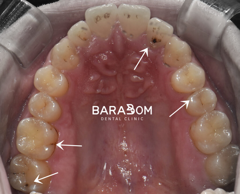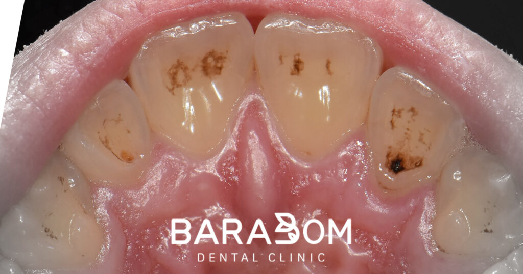 치아 곳곳에 충치와 치석 변색이 나타나 있습니다.