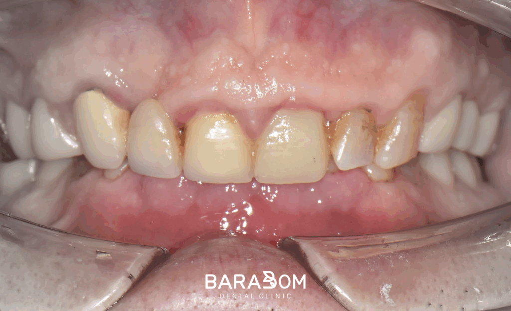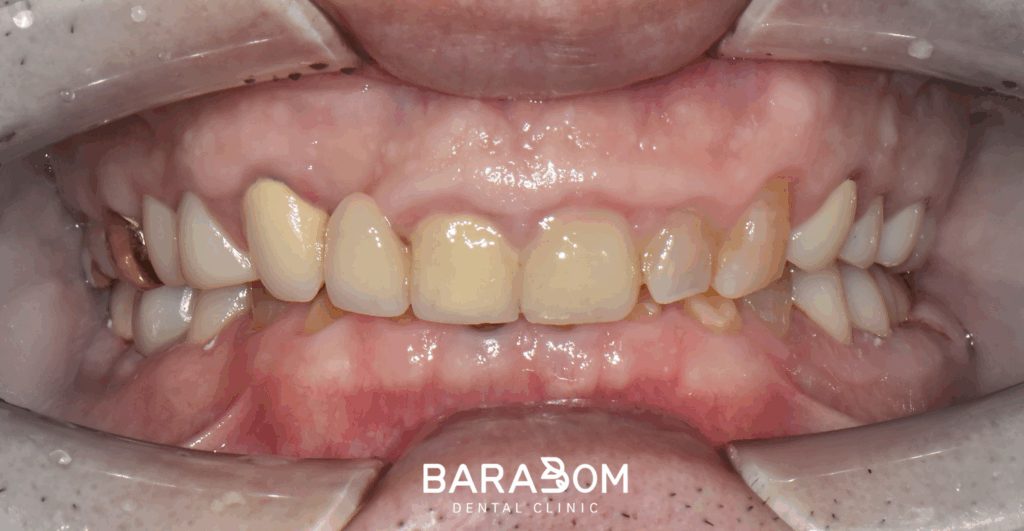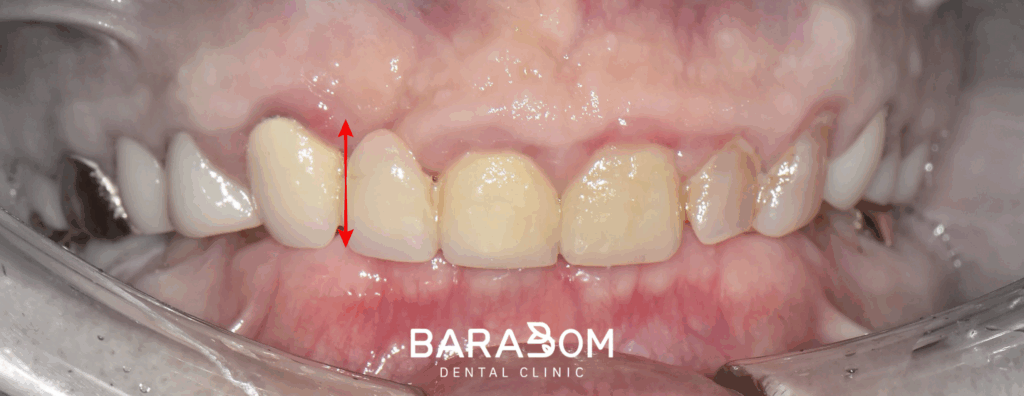 전/후 사진을 보시면 확실히 앞니의 치아 머리 부분이 연장되면서 크라운이 올라갈 공간이 확보된 모습이 관찰되고 있습니다.