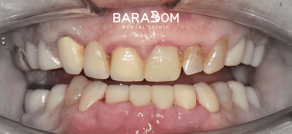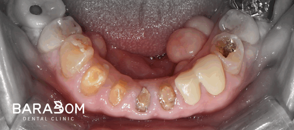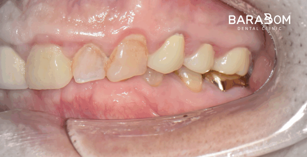 그럼 자주 보철이 탈락하게 되어 불편으로 이어질 수 밖에 없는데, 현재 하악 앞니 뿐만 아니라 어금니도 치아 머리의 길이가 짧은 상태였습니다. 하악 절치부 치관 길이가 매우 짧으며, 상악 절치 구개부와 간격이 불과 2mm 이내였습니다. 현재 상태로써 새로운 보철을 제작하긴 어렵다 판단되고 있습니다.